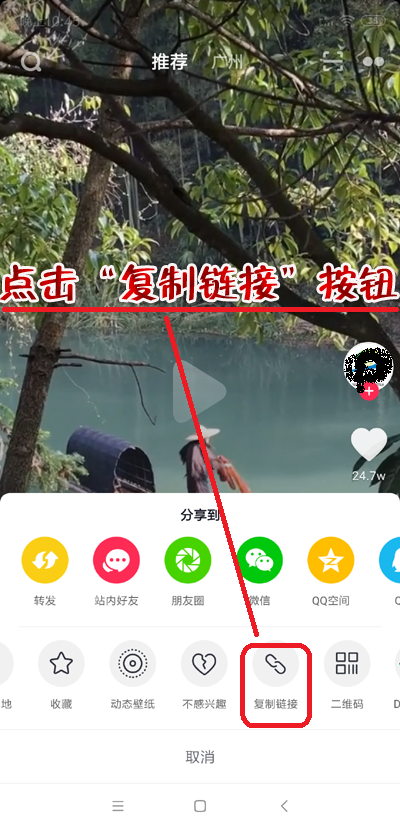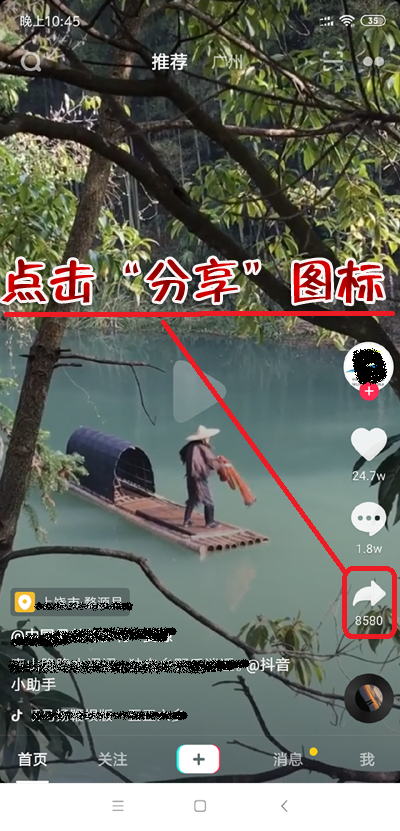 一、在抖音的视频界面,点击“ 分享 ”图标
